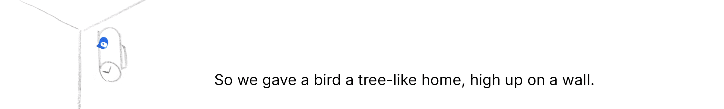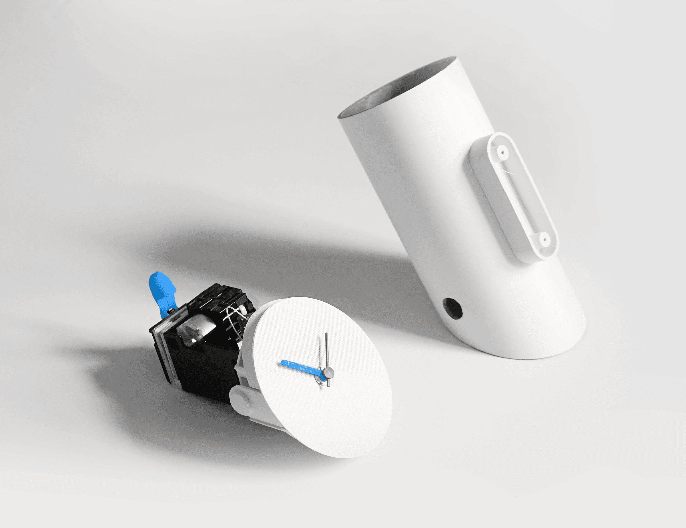 We found a contradiction in the traditional cuckoo clock. Since the bird lives in trees, we wanted to symbolize trees rather than imitating human habitats, and naturally allow them to be installed high up. Accordingly, the clock face is placed on the sloping bottom of the cylinder, providing a comfortable viewing height for the occupants. The cuckoo sings periodically according to the setting.