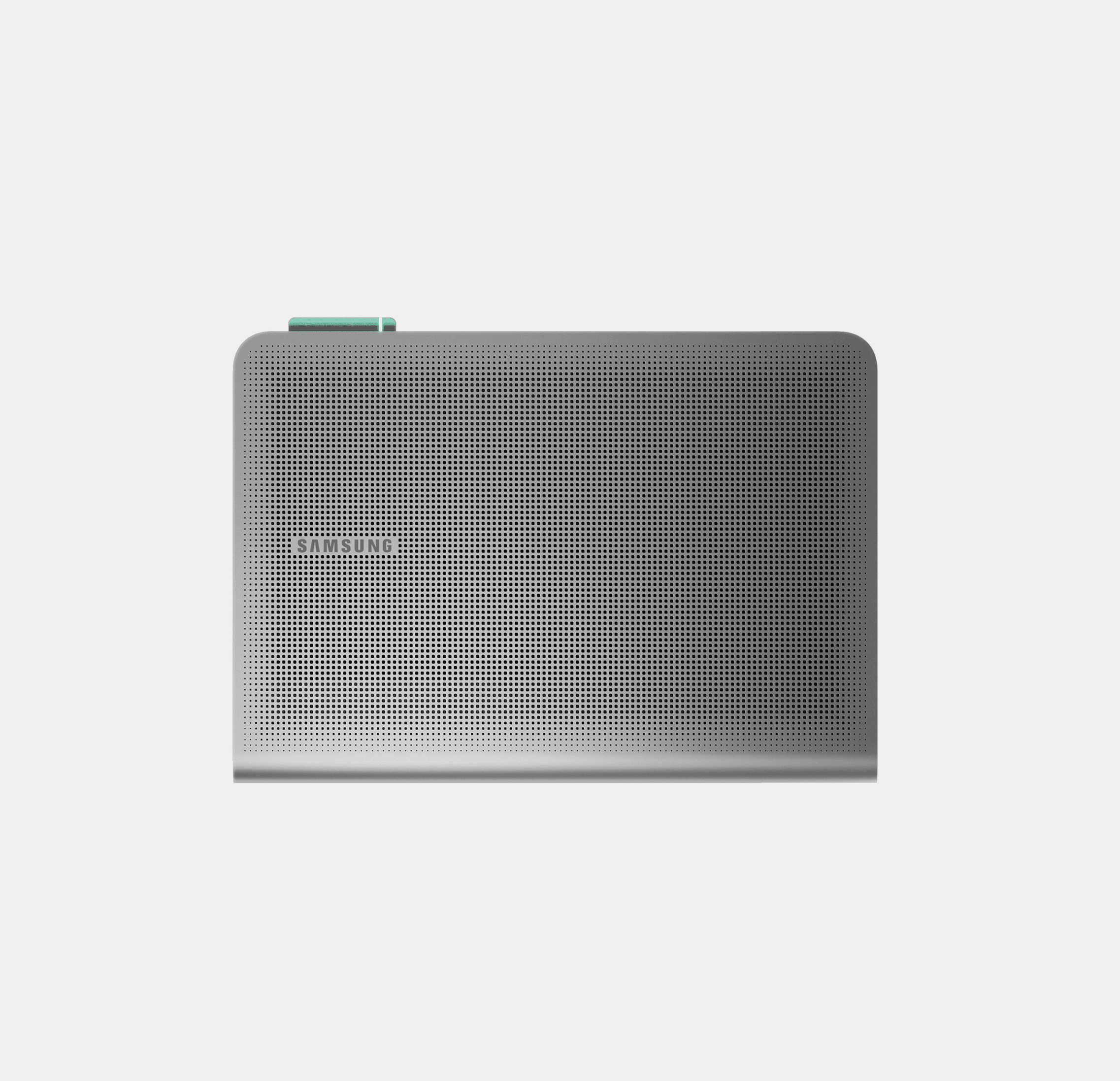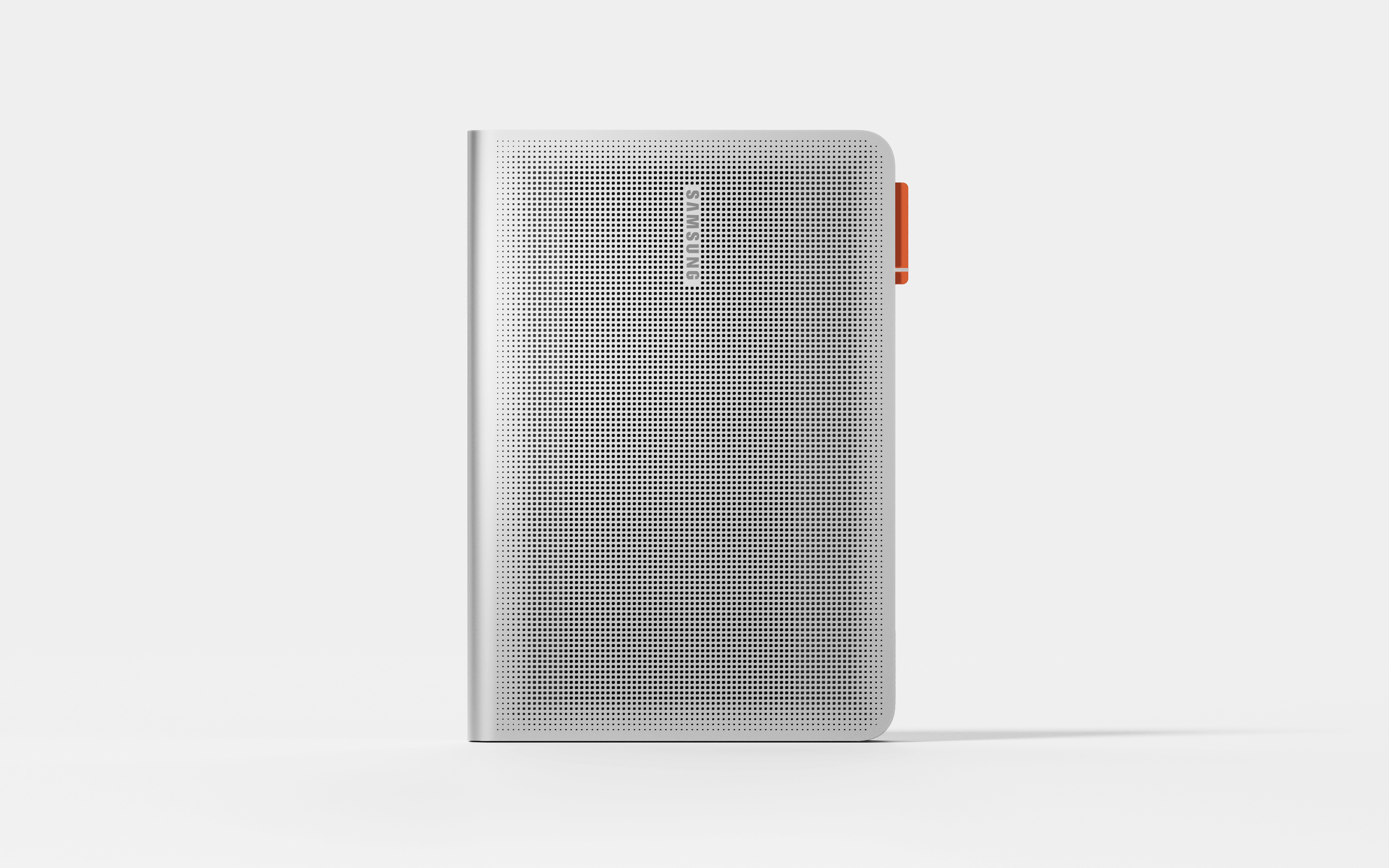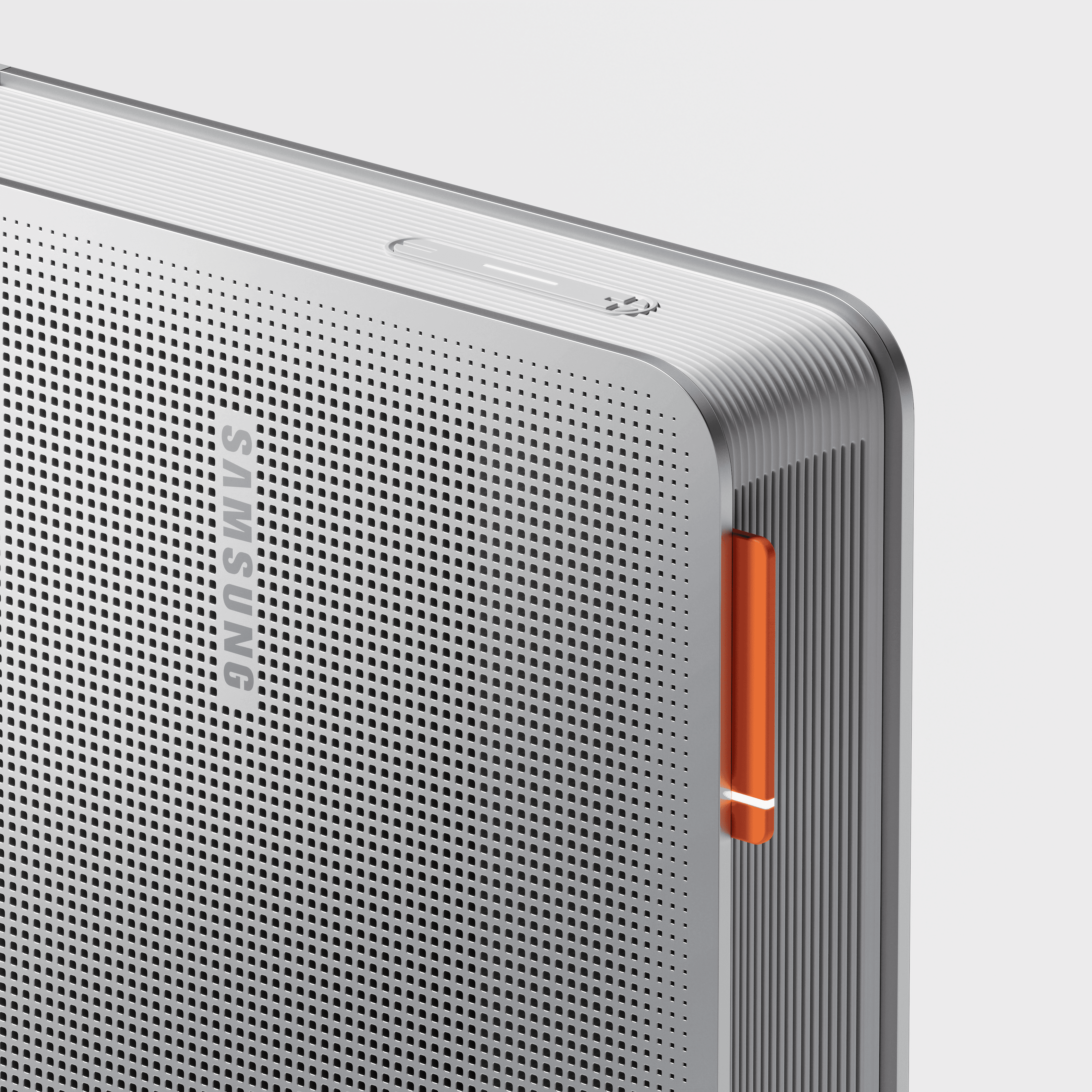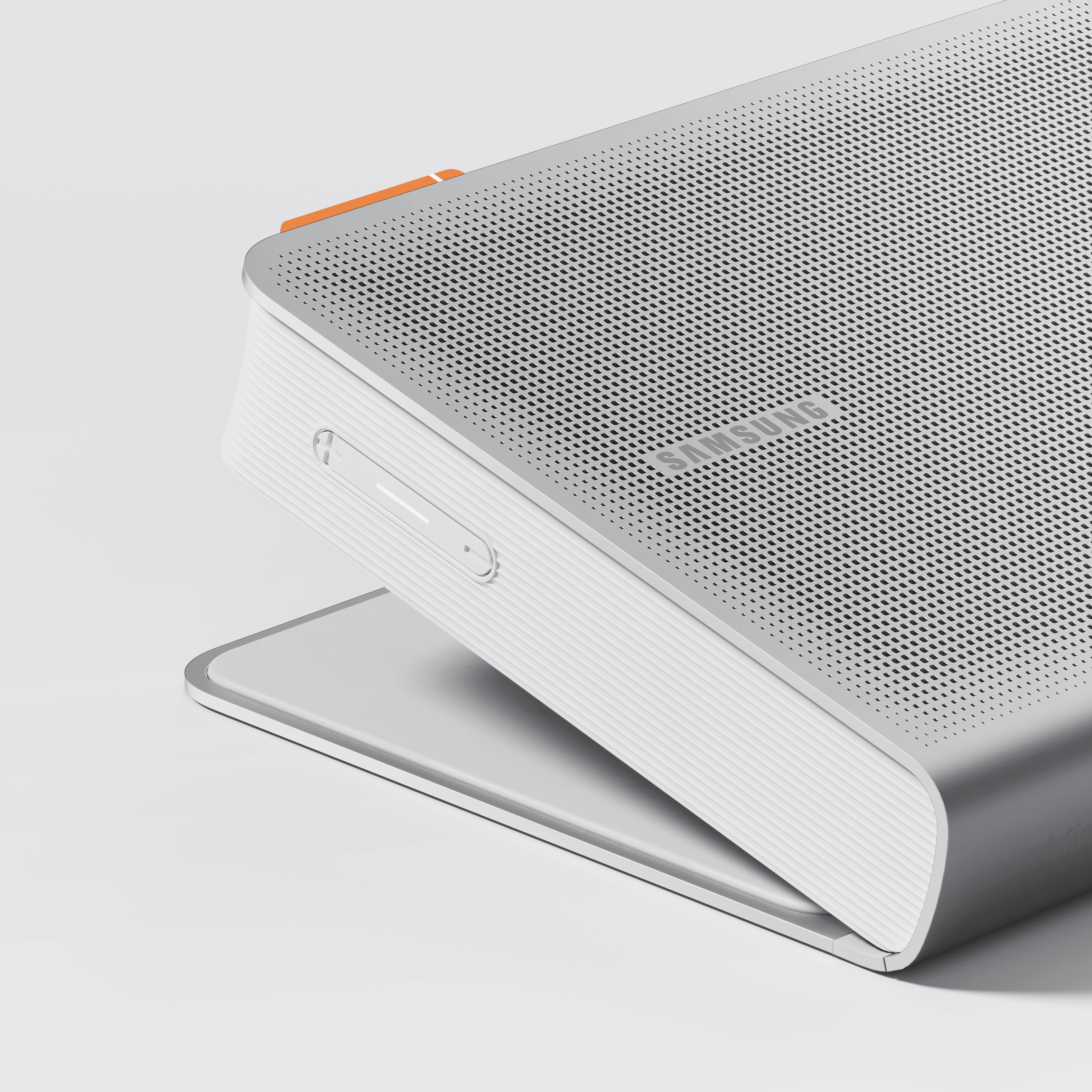 Samsung Portable Air Purifier features a smooth, curved design inspired by the thickness and solidity of a hardcover book. The aluminum hard cover, precisely finished with clean edges, adds durability and a premium character to the product. NC machining combined with a sandblasted finish creates a subtle texture and refined feel. The densely perforated vent holes across the entire surface form an efficient ventilation system, allowing air to flow smoothly while preserving a clean appearance.The product can be tilted like opening a book, allowing it to be placed either flat or upright depending on the user’s preference. Beneath the aluminum cover, there is a patterned surface that resembles stacked paper, and along its edge, the color accent bookmark element that functions as the power button.