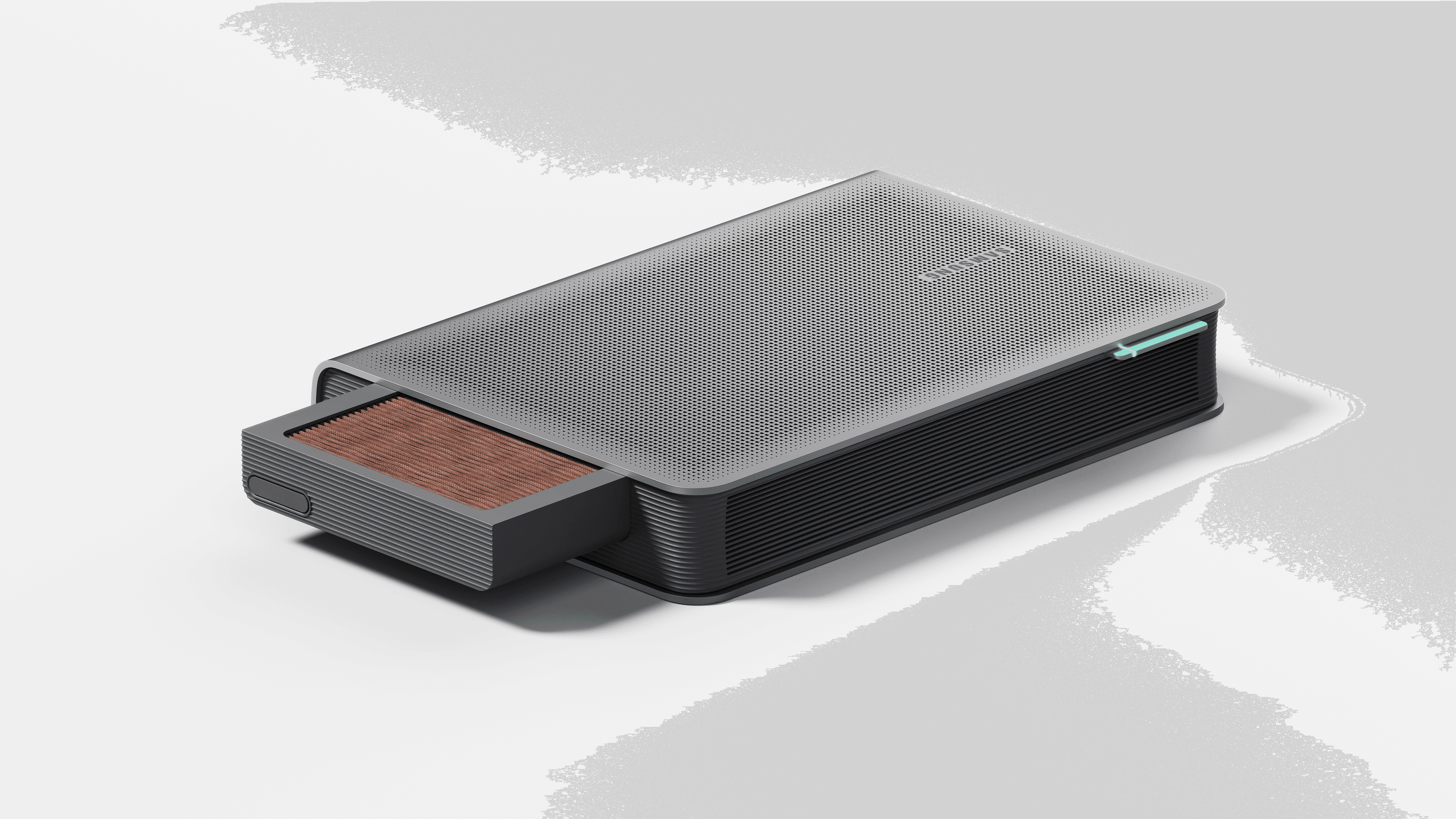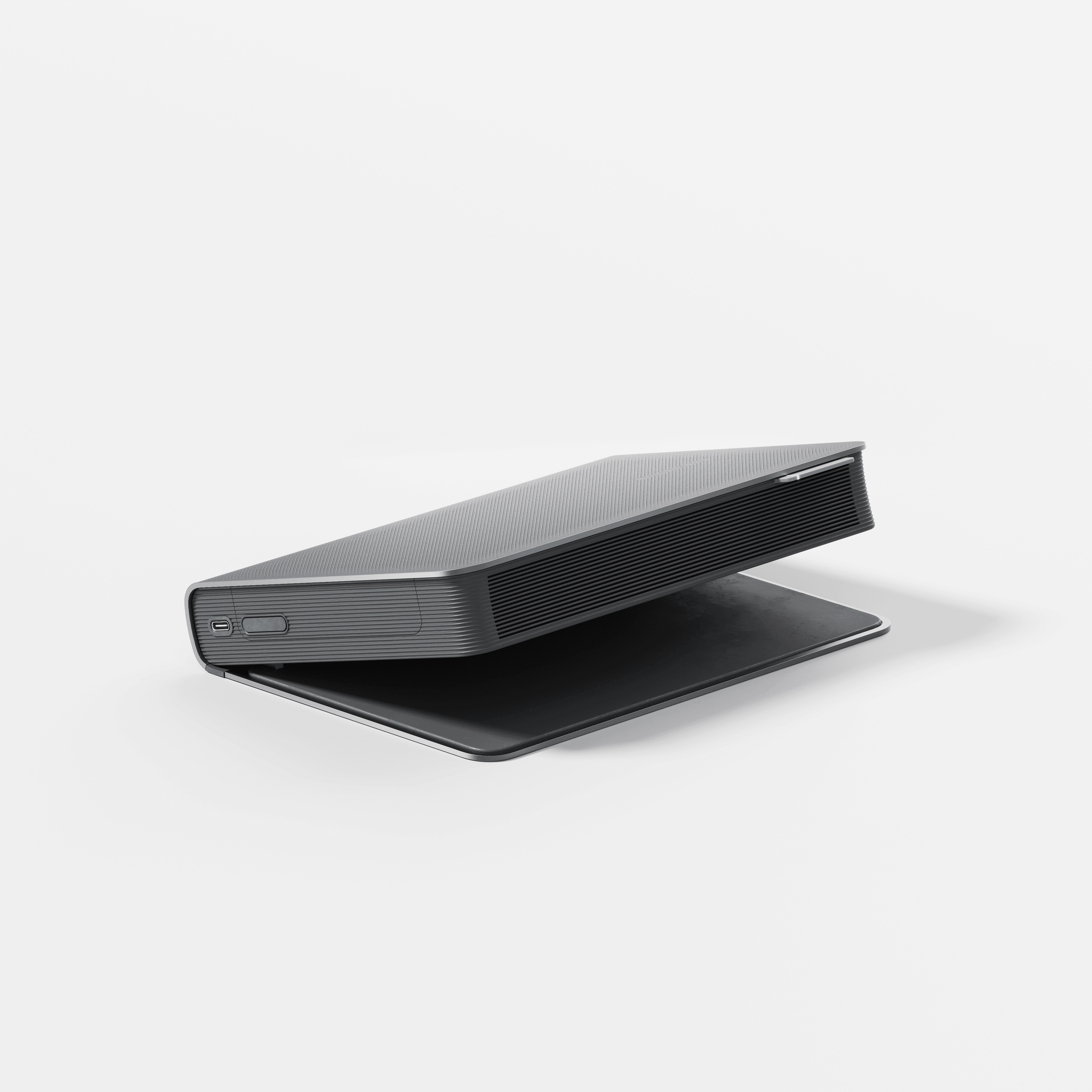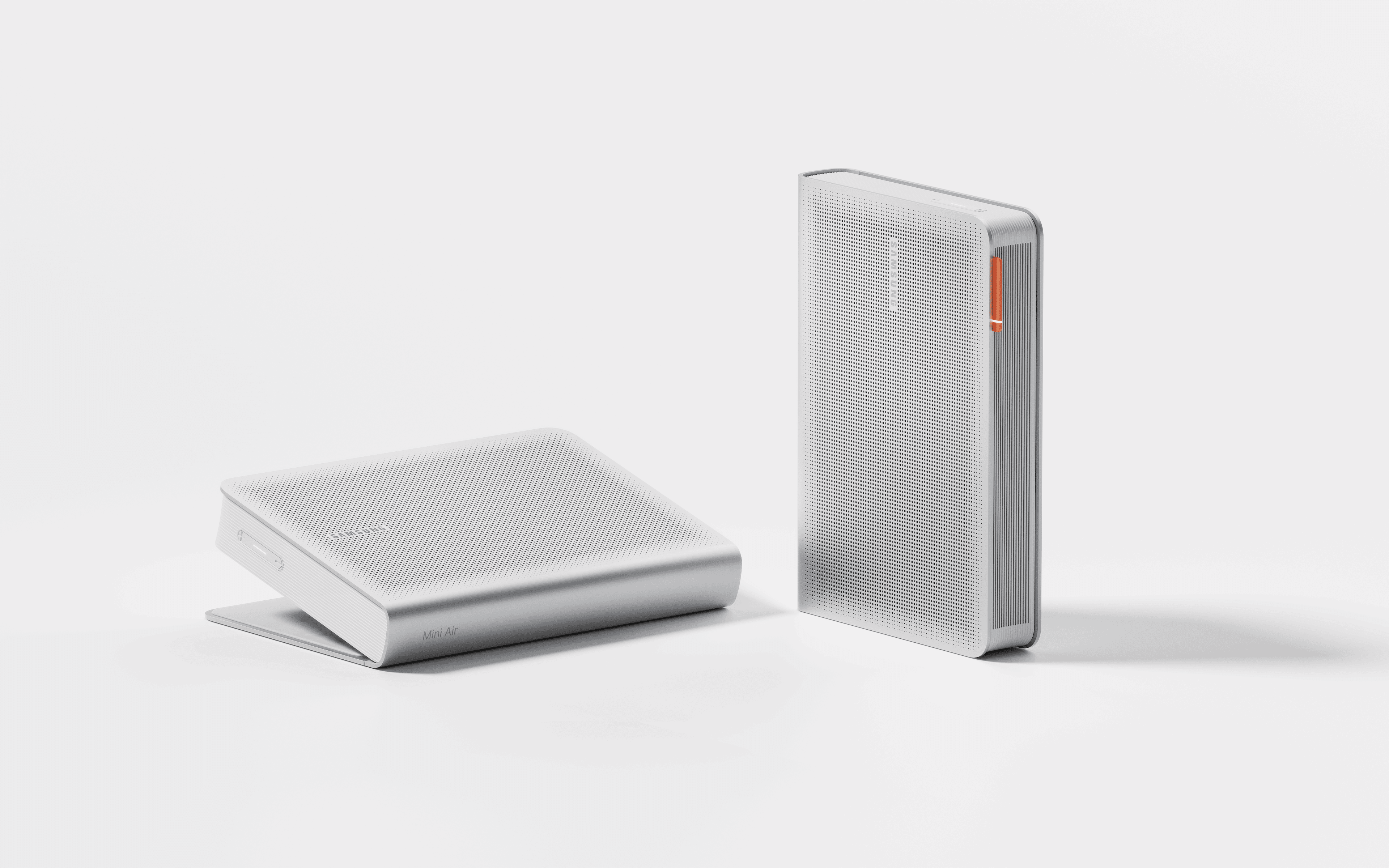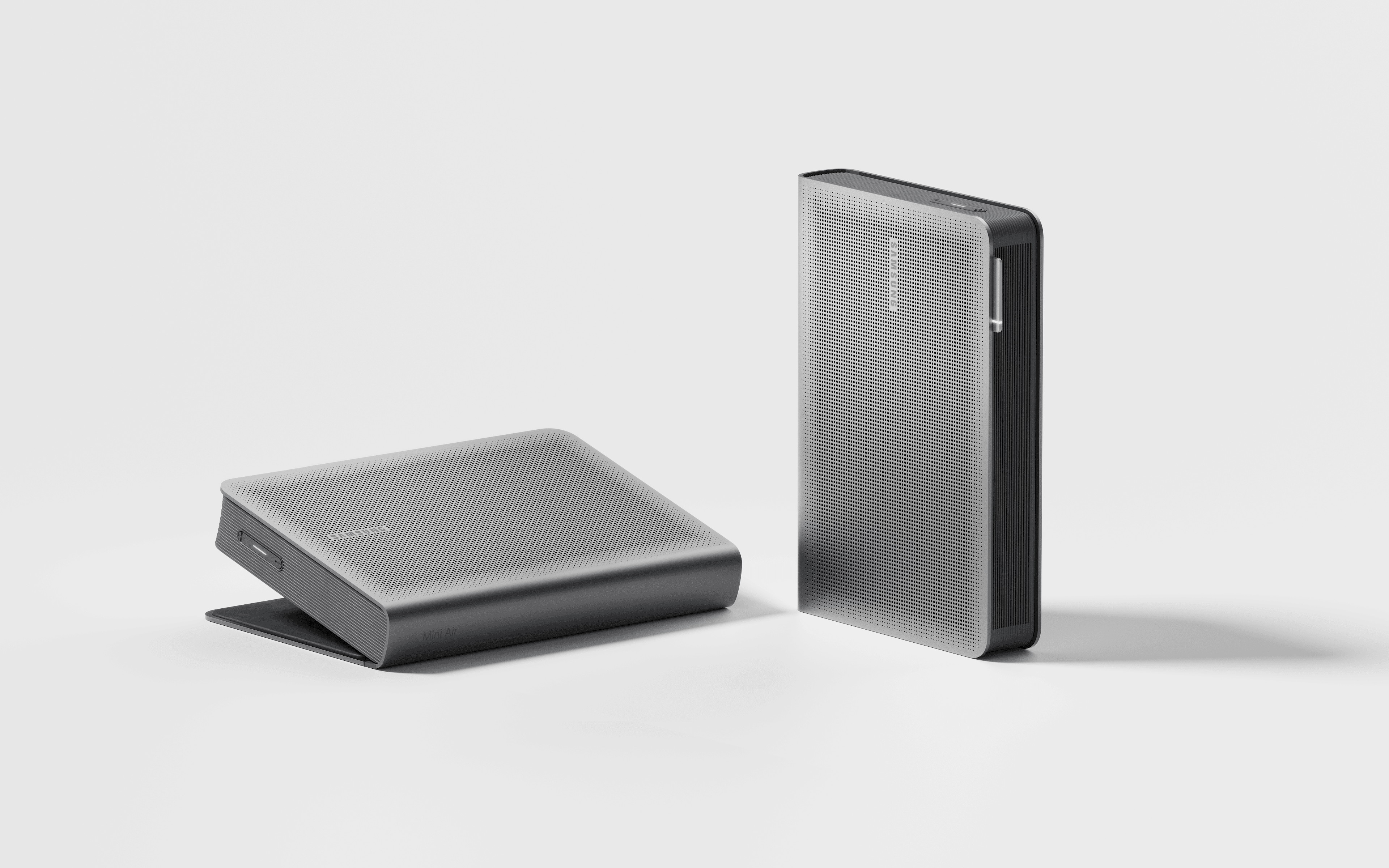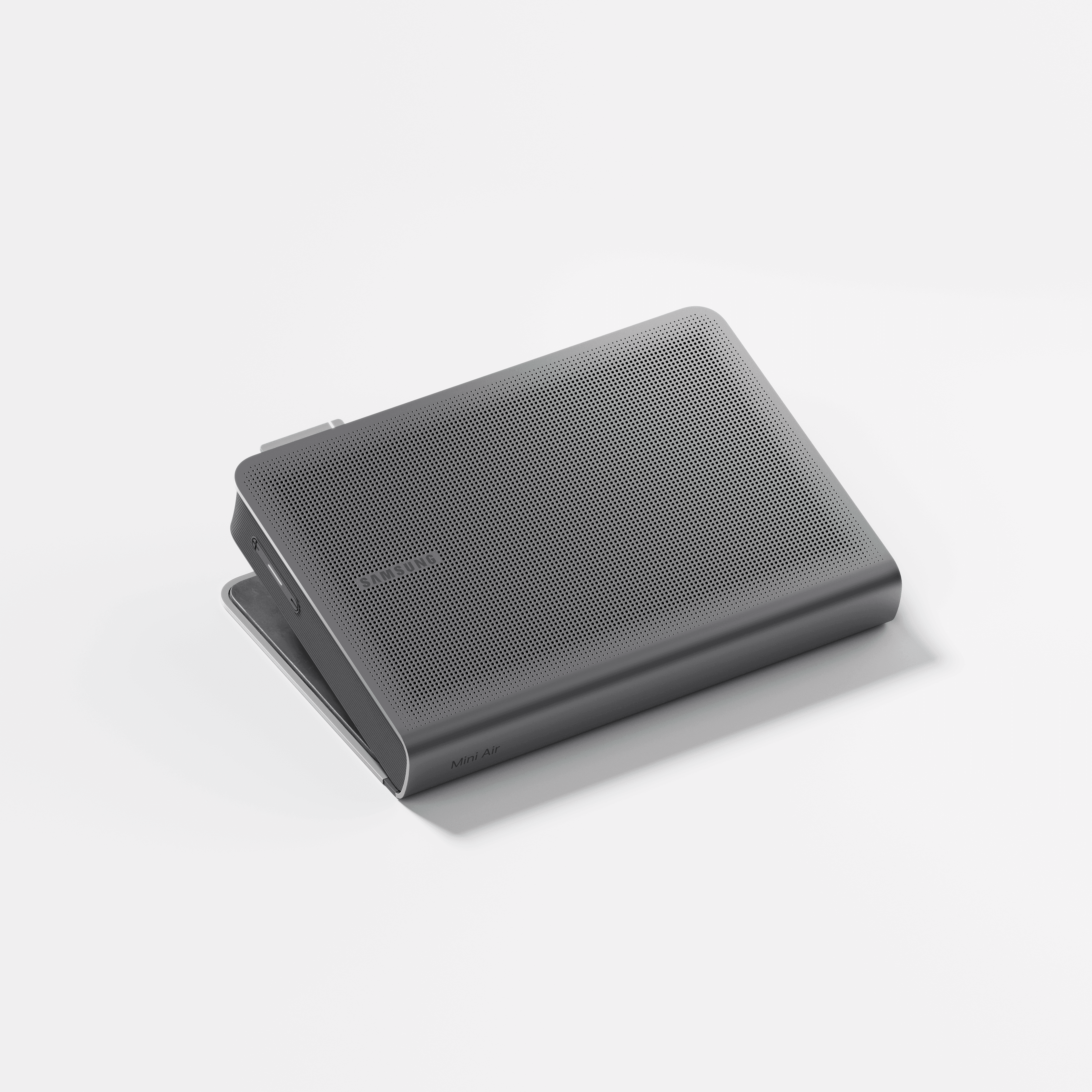 Samsung Portable Air Purifier features a smooth, curved design inspired by the thickness and solidity of a hardcover book. The aluminum hard cover, precisely finished with clean edges, adds durability and a premium character to the product. NC machining combined with a sandblasted finish creates a subtle texture and refined feel. The densely perforated vent holes across the entire surface form an efficient ventilation system, allowing air to flow smoothly while preserving a clean appearance.The product can be tilted like opening a book, allowing it to be placed either flat or upright depending on the user’s preference. Beneath the aluminum cover, there is a patterned surface that resembles stacked paper, and along its edge, the color accent bookmark element that functions as the power button.