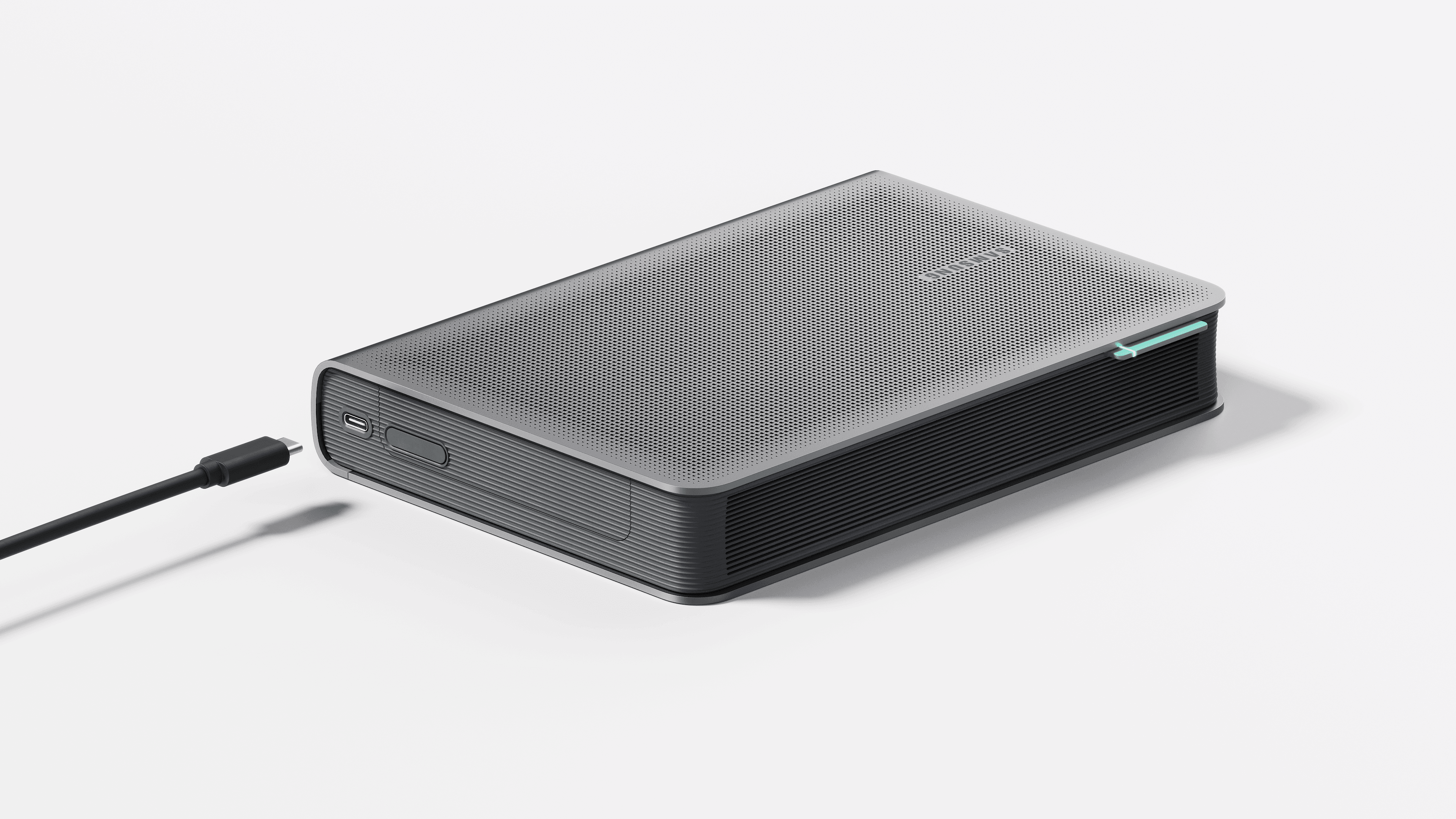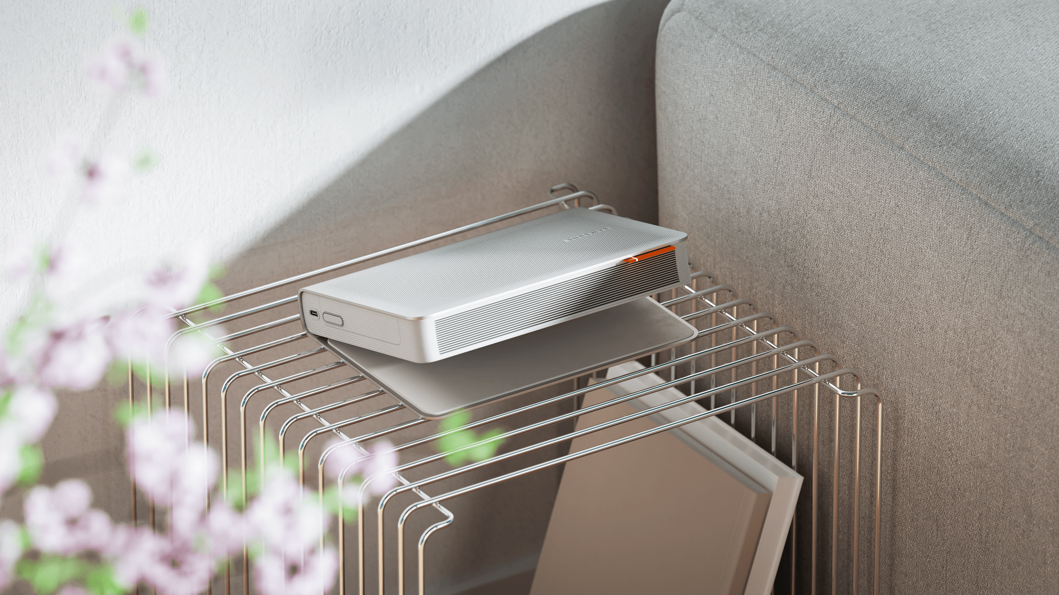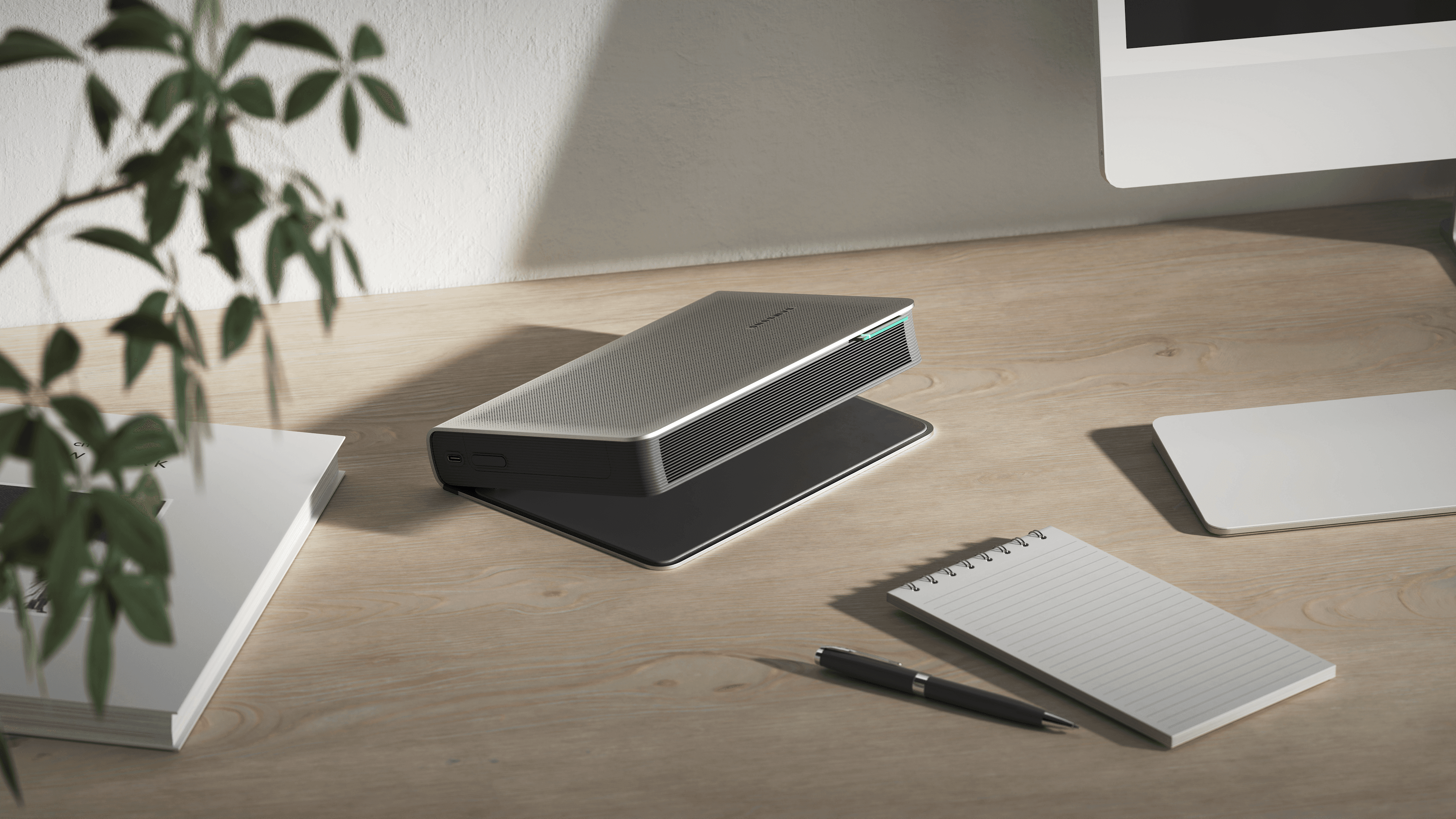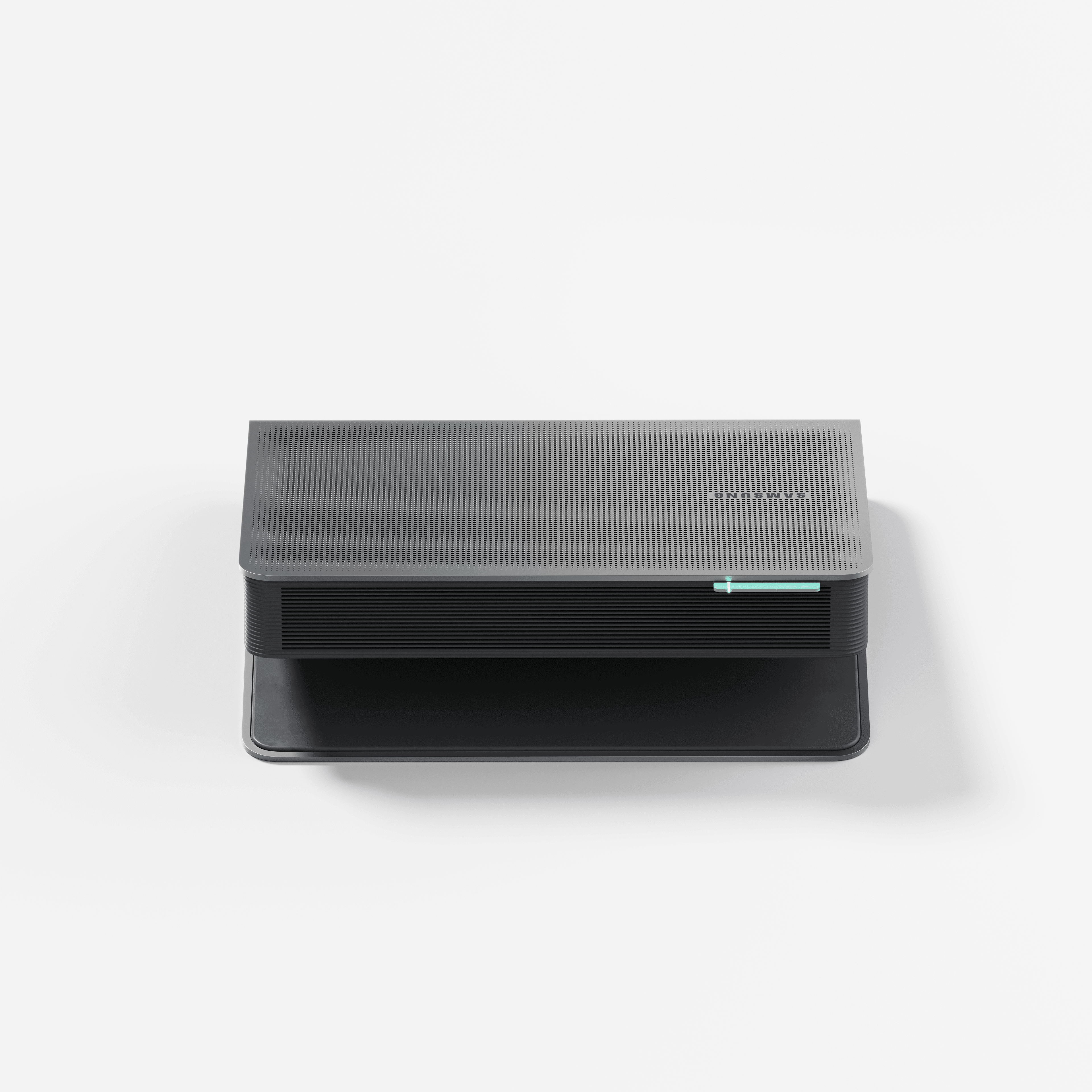 Samsung Portable Air Purifier features a smooth, curved design inspired by the thickness and solidity of a hardcover book. The aluminum hard cover, precisely finished with clean edges, adds durability and a premium character to the product. NC machining combined with a sandblasted finish creates a subtle texture and refined feel. The densely perforated vent holes across the entire surface form an efficient ventilation system, allowing air to flow smoothly while preserving a clean appearance.The product can be tilted like opening a book, allowing it to be placed either flat or upright depending on the user’s preference. Beneath the aluminum cover, there is a patterned surface that resembles stacked paper, and along its edge, the color accent bookmark element that functions as the power button.