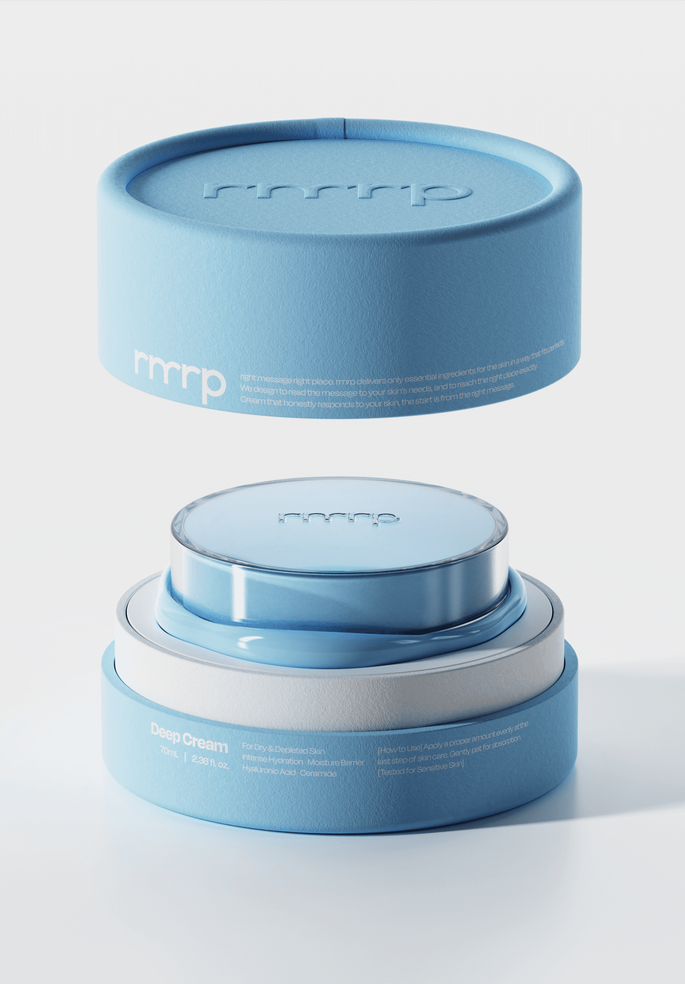 rmrp facial cream provides essential skincare with a customized formula. Featuring a formulation that reflects nutrient absorption, color-coded and refillable designs enhance the feeling of use and longevity. Colors are used to differentiate functions for each skin type. Paper-based packaging reduces environmental impact, while flowing, creamy curves visually express softness and moisture.