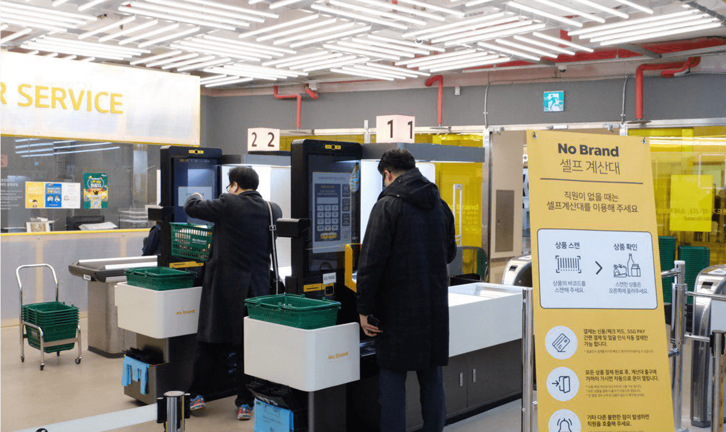 E-Mart developed a system that automatically recognizes when a customer places the purchased product on the counter and completes the checkout process using camera recognition technology. To reduce uncertainty in the unmanned checkout process, they studied the checkout process and the movements of actual users using testers of various heights. After creating a sample, they conducted a pilot service for two months at the COEX Nobrand store.