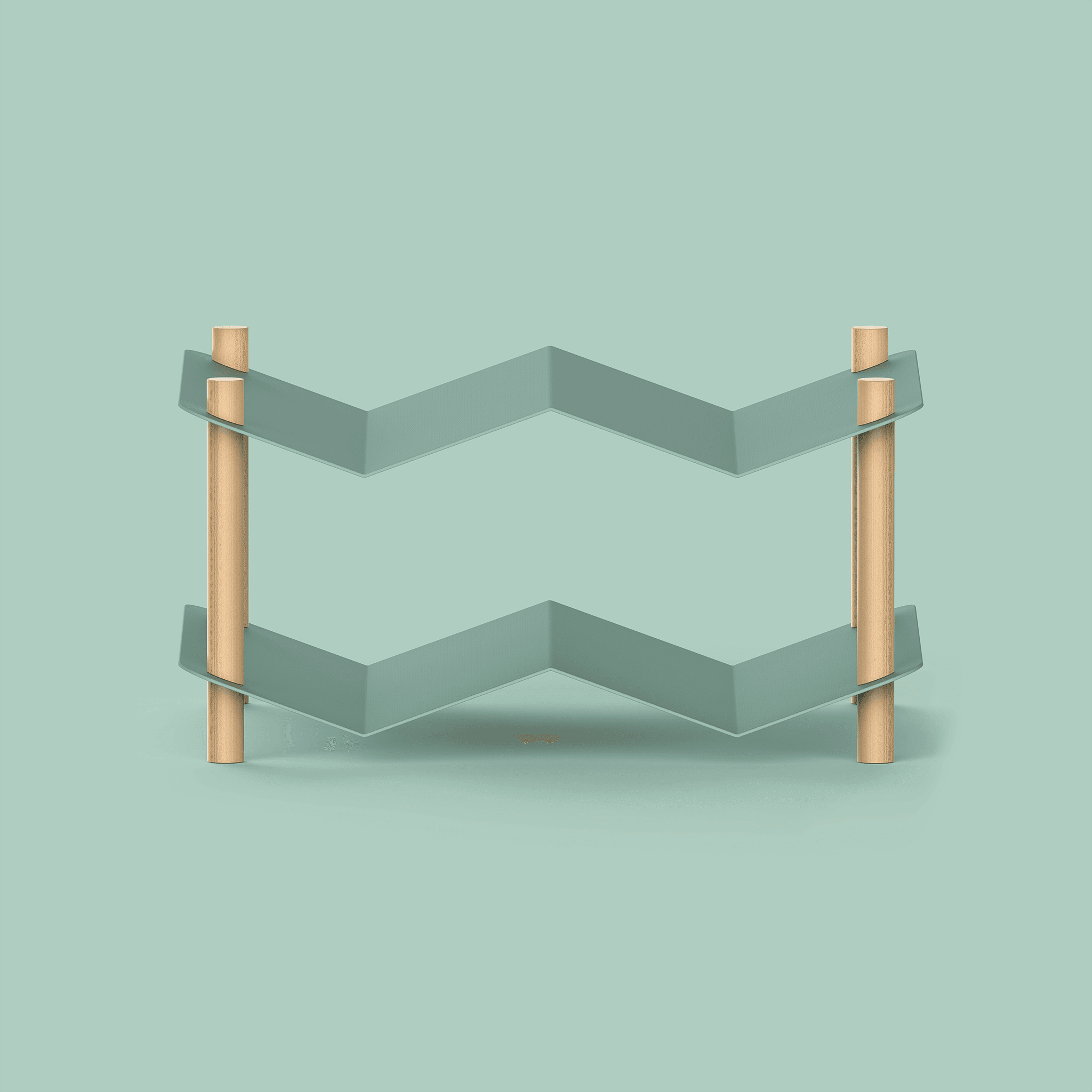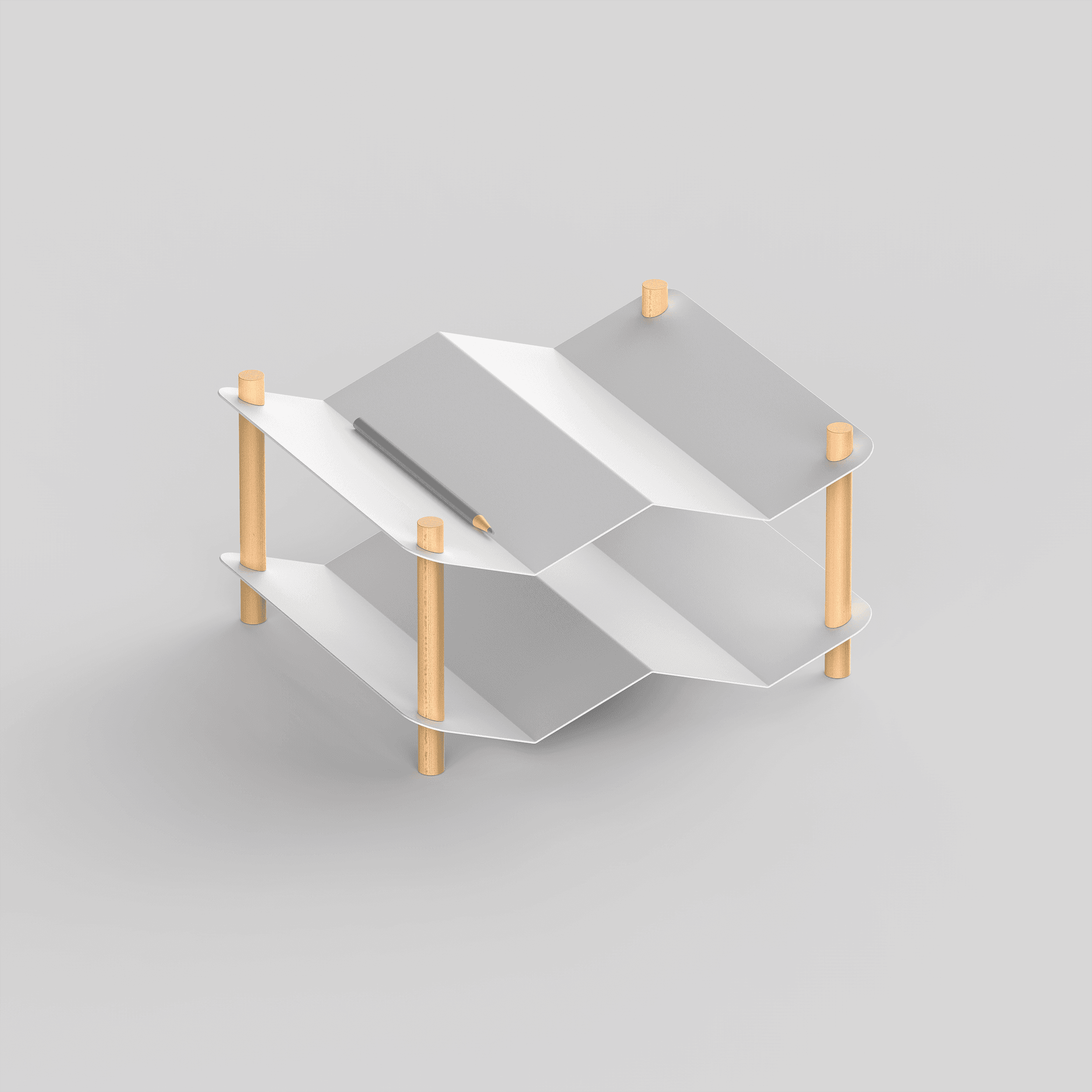 From the seriousness conveyed by materials, we can infer value. Metal is heavy, but conveys a sense of lightness when it is thin, and light wood holds down a metal that is trying to spread its wings. Two different materials form a complementary structure.